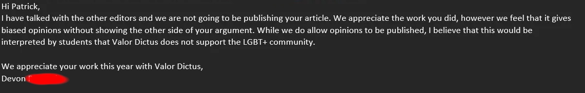 My article apparently threatened the “LGBTIA+ community” and thus was not published, and my image was removed by Mr Moore who evidently possessed more editorial control than he had previously admitted. My suspicion is that it was Mr Moore who suggested that Devon stop responding to my emails, but I can’t say that for sure. I sent off an email to the other editors in a sort of last appeal, but it came to nothing, and I forgot to save the exchange. The long and short of it was that I didn’t think the publication of a single article could render an entire school unsafe.