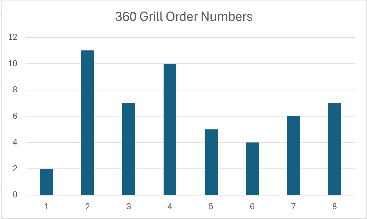 I keep a note with all the random text I need to put down over the day, and don’t clean it, so I’ve been using the same note for several years now. One of the things that I use that note for is listing the number I received for the 360 Grill, a meal station at the rot. I tried to run an AI analysis on the data, but unless I’m tragically bad at counting, the computer did not compute the correct totals, so I did it myself to receive this graph.